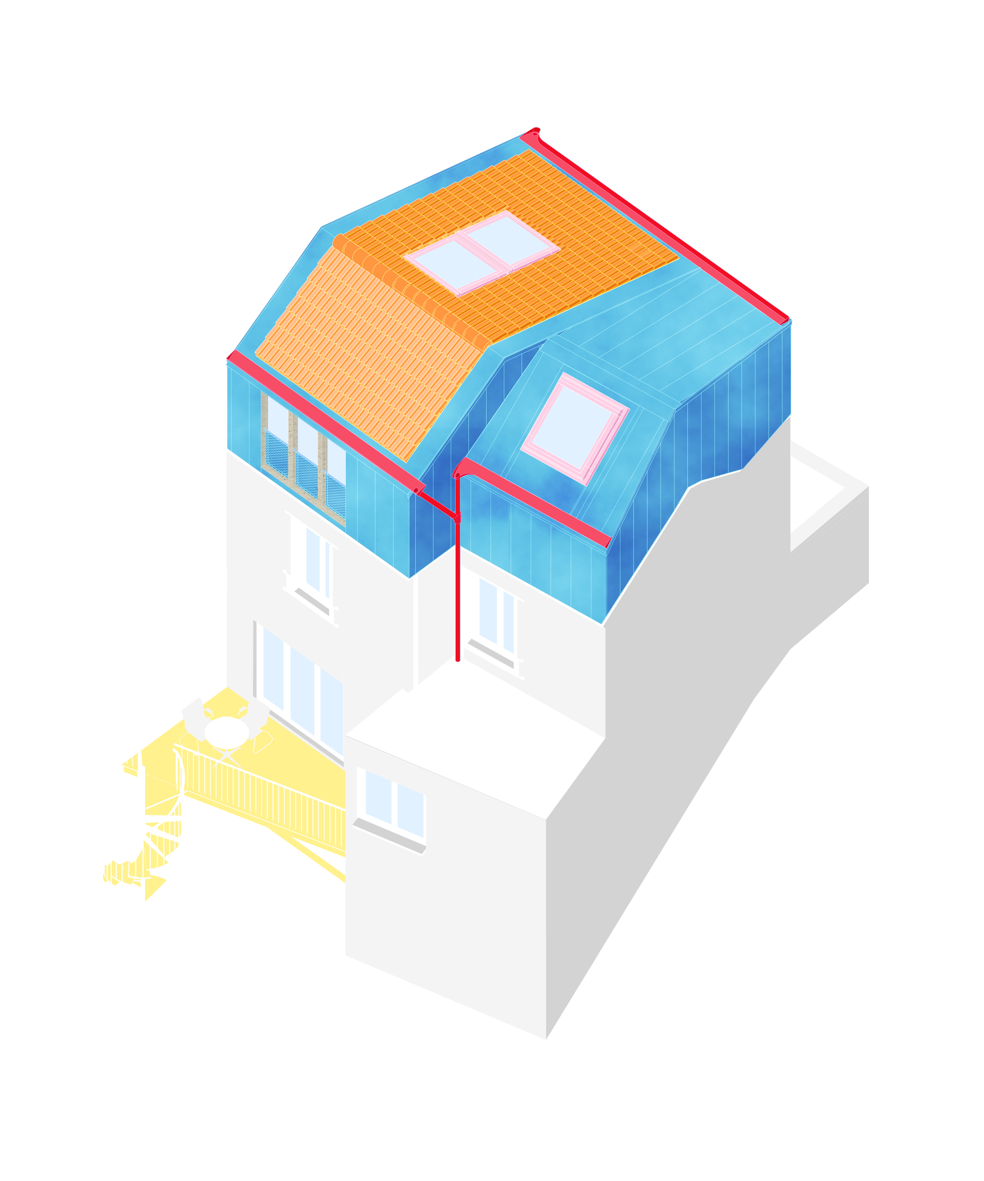 La surélévation de cette maison de briques enduites et peintes prend la forme volume dynamique accueillant deux chambres supplémentaires, une salle de bains et un dressing.